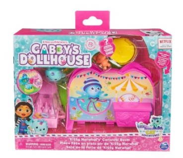 Mit den Deluxe Room Spielsets von Spin Master können Kinder ab 3 Jahren ihre Lieblingsszenen aus der der beliebten Serie "Gabby's Dollhouse" nachspielen. Dieses Spielset enthält einen katz-tastischen Puppenhaus-Festraum und Möbel, die sowohl mit dem Kreuzfahrtschiff als auch in Gabbys Purrfect Puppenhaus verwendet werden können (jeweils separat erhältlich). Im Lieferumfang sind eine niedliche Kätzchen Narwal-Figur, ein Bällebad, ein Katzen-Ringwurf-Spiel, eine Snackbar und vieles mehr enthalten. Außerdem gibt es eine kleine Überraschung zu entdecken: ein Karamell-Apfel.