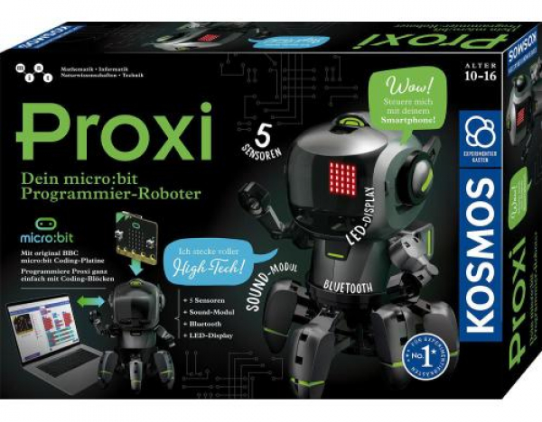 Ein Roboter der zum Beispiel „Schere, Stein, Papier“ spielt, rechnen kann, zum Kompass oder digitalen Würfel wird, die Temperatur misst, per App ferngesteuert werden kann – das ist Proxi. Der Aufbau von Proxi ist Bestandteil des Experimentierkastens und natürlich zeigt die Anleitung Schritt für Schritt, was zu tun ist und gibt Hinweise, worauf beim Zusammenbau zu achten ist. Das fördert die Feinmotorik und gibt einen tollen Einblick ins Innenleben des Roboters. Auf diese Weise können Kinder die Funktionsweise von Proxi sehr gut nachvollziehen. Ist Proxi einmal aufgebaut, kommt die micro:bit-Platine ins Spiel. KOSMOS bietet Programmieranfängern fertige Codes zum Download an, damit direkt mit Proxi losgespielt werden kann. Kinder müssen dafür nur den micro:bit mit dem mitgelieferten USB-Kabel an einen Computer anstecken und den heruntergeladenen Code per „drag and drop“ auf die Platine ziehen. Anschließend wird der micro:bit einfach in Proxis Kopf eingesteckt und der Spaß kann beginnen: Er singt und tanzt, wird zur Bowlingkugel oder zeigt kleine Notizen in seinem Display an. Selbstverständlich können Kinder die micro:bit-Platine auch selbst programmieren. Wie das geht, erklärt die Anleitung kindgerecht und anhand eines anschaulichen Beispiels. Die micro:bit Platine wird mithilfe einer grafischen, blockbasierten Programmiersprache programmiert (MakeCode). Kinder können die bestehenden Codes modifizieren oder ganz eigene Programme schreiben. Und natürlich steht ihnen das gesamte Wissen und alle Projekte der riesigen micro:bit-Community offen. Zugang zum Programmier-Editor und zu Community-Projekten erhalten Nutzer über die Seite microbit.org die von der Micro:bit Educational Foundation betrieben wird, einer non-profit-Organisation deren Ziel es ist, Kindern den Zugang zu Bildung im Bereich der IT zu ermöglichen. Proxi ist ein von der Microbit-Stiftung anerkanntes micro:bit-Zubehör-Set.