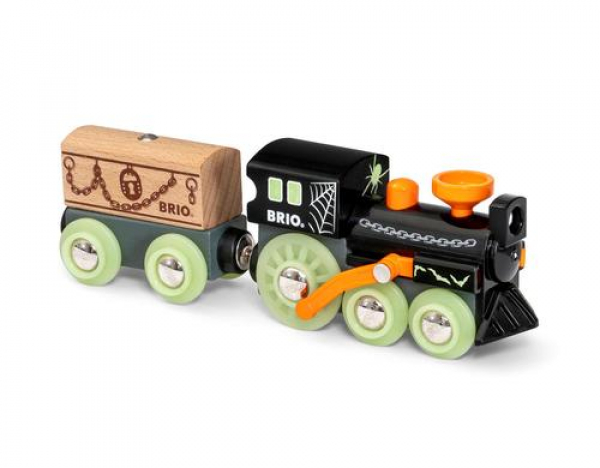 Huh-huh-huuuh! Etwas Unheimliches kriecht die Schienen entlang. Der Geisterzug leuchtet im Dunkeln und hat eine Holzkassette im Schlepptau – was da wohl drin ist? Mit den bekannten BRIO Magnetverbindungen kann diese gespenstische Dampflok mit allen anderen Loks und Waggons verbunden werden und die BRIO World erschrecken.