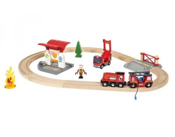Ein Feuer ist ausgebrochen und sie brauchen deine Hilfe! Fahr schnell zum Bahnhof, um den Feuerwehrzug mit Wasser zu betanken. Der Feuerwehrmann kommt im Feuerwehrauto mit heulenden Sirenen und Blaulicht hinterher. Lösche das Feuer mit dem Feuerwehrschlauch auf dem Waggon. Für noch mehr Spaß und ein größeres Schienenlayout fügst du einfach mehr Holzschienen von BRIO hinzu.