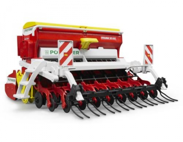 Die Pöttinger Vitasem 302ADD Kreiselegge-Sämaschine dient der landwirtschaftlichen Bodenbearbeitung und beherrscht eine besonders exakte und schnelle Saatgutdosierung. Präziser säen und erfolgreicher ernten ist das Motto der von Pöttinger hergestellten Kombinationseinheit. Das Modell von BRUDER besitzt eine Anbauschnittstelle, die eine Verwendung der Kreiselegge-Sämaschine an sämtlichen Traktoren aus dem Sortiment erlaubt. Durch die integrierte Hubmechanik lässt sich sowohl die Transport- als auch die Arbeitsstellung durch heben und senken der Einheit originalgetreu nachspielen. Die zusätzlich erhältlichen Spielfiguren von BRUDER können über die klappbare Treppe auf die Kombination gehen, um z.B. den Saatguttank zu öffnen. Nachdem dieser befüllt, die Kombination an den Traktor angehängt und der Auslass-Schieber geöffnet wurde kann die Arbeit beginnen. Zahlreiche Details unterstützen die optische Wirkung und machen somit das Spielen noch realistischer.