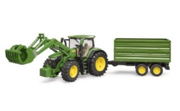 Eine moderne Landwirtschaft ist ohne moderne Traktoren gar nicht mehr vorstellbar. Da die Arbeit der Landwirte nicht nur vielschichtig, sondern auch voller Herausforderungen ist, brauchen sie die richtige Technik. Traktoren der Serie 7R von John Deere verbinden ein geringes Gesamtgewicht mit hohen Leistungen. Dieser agile Traktor beschleunigt nicht nur Transporte, sondern bringt jeden Betrieb voran. Dieser wichtige Traktor ist bei BRUDER, in der Themenwelt Landwirtschaft zu finden. Getreu dem Bruder Motto „Just like the real thing“, ist der Traktor mit vielen, realistischen Details ausgestattet. Die Motorhaube öffnet sich und zeigt den imposanten Motor. Türen sind zu öffnen und bieten den optional erhältlichen bworld Figuren Platz in einer modernen Kabine. BRUDER typisch ist die ausgezeichnete Steuerbarkeit und Fahrkomfort durch die eingebaute Pendelachse und die durch das Schiebedach einsetzbare Lenkverlängerung. In diesem Set enthalten ist auch ein Tandemachsanhänger in John Deere-Farbe. Der Anhänger besitzt eine Kippfunktion. Die oberen Bordwände können abgenommen und die unteren Bordwände können nach 3 Seiten geöffnet werden. Durch die höhenverstellbare Heckkupplung des Traktors können aber auch alle anderen Anhänger der Themenwelt Landwirtschaft benutzt werden und durch den vorhandenen Frontlader auch gleich beladen.
