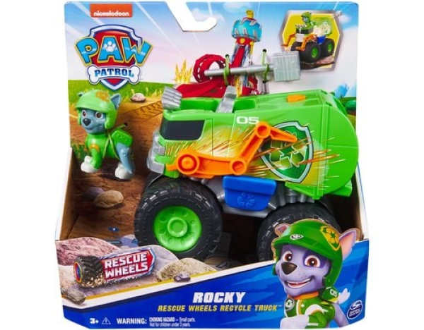 Chaos in der Abenteuerbucht! Dort findet eine Monstertruck-Rallye statt, an der auch der Trucker Boomer teilnimmt. Er gewinnt aber nicht und ärgert sich so sehr, dass er nun für allerlei Ärger sorgt. Die tierischen Helden der Paw Patrol mit ihren Rescue Wheels Monstertrucks sind also gefragt. Rockys Recycling Truck steht auf riesigen Rädern und sieht genauso cool aus wie der Monstertruck aus der Serie. Er besitzt außerdem einen Geschoss-Abwurf, mit dem über einen Knopf ein Geschoss abgefeuert werden kann. Also Boomer, komm Rocky besser nicht in die Quere!